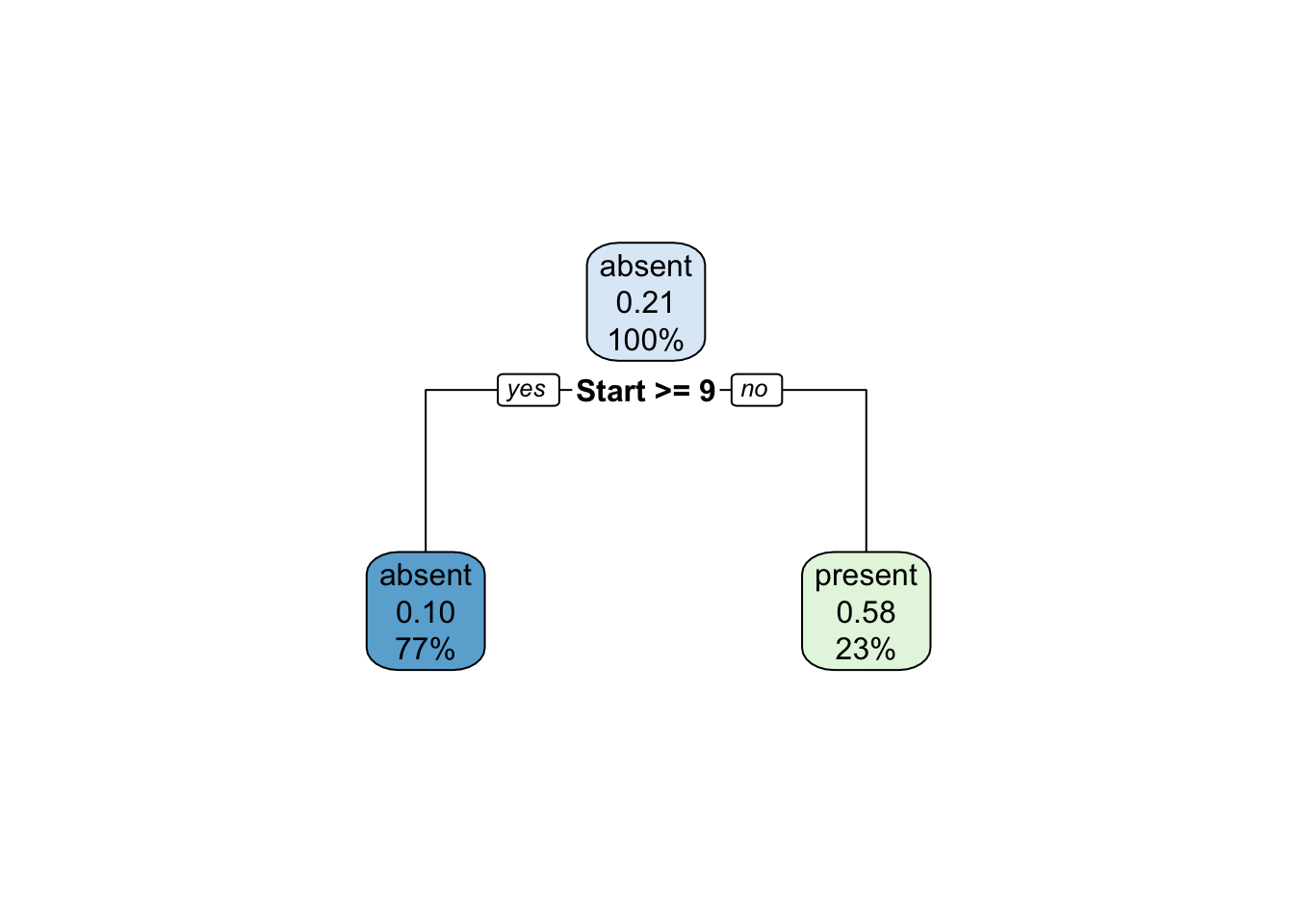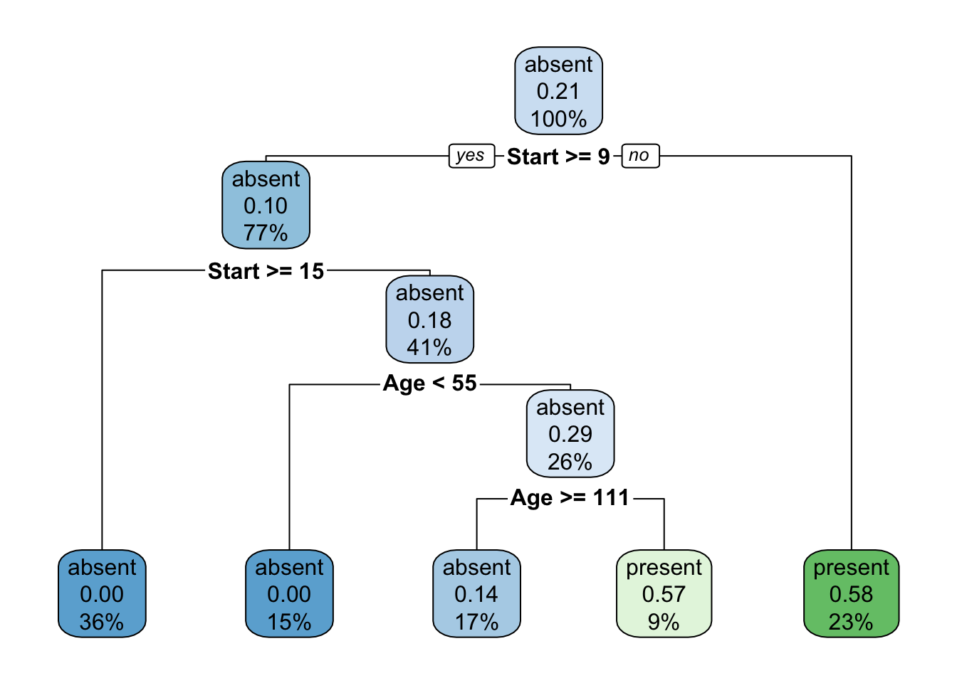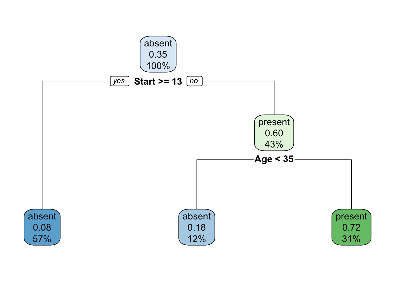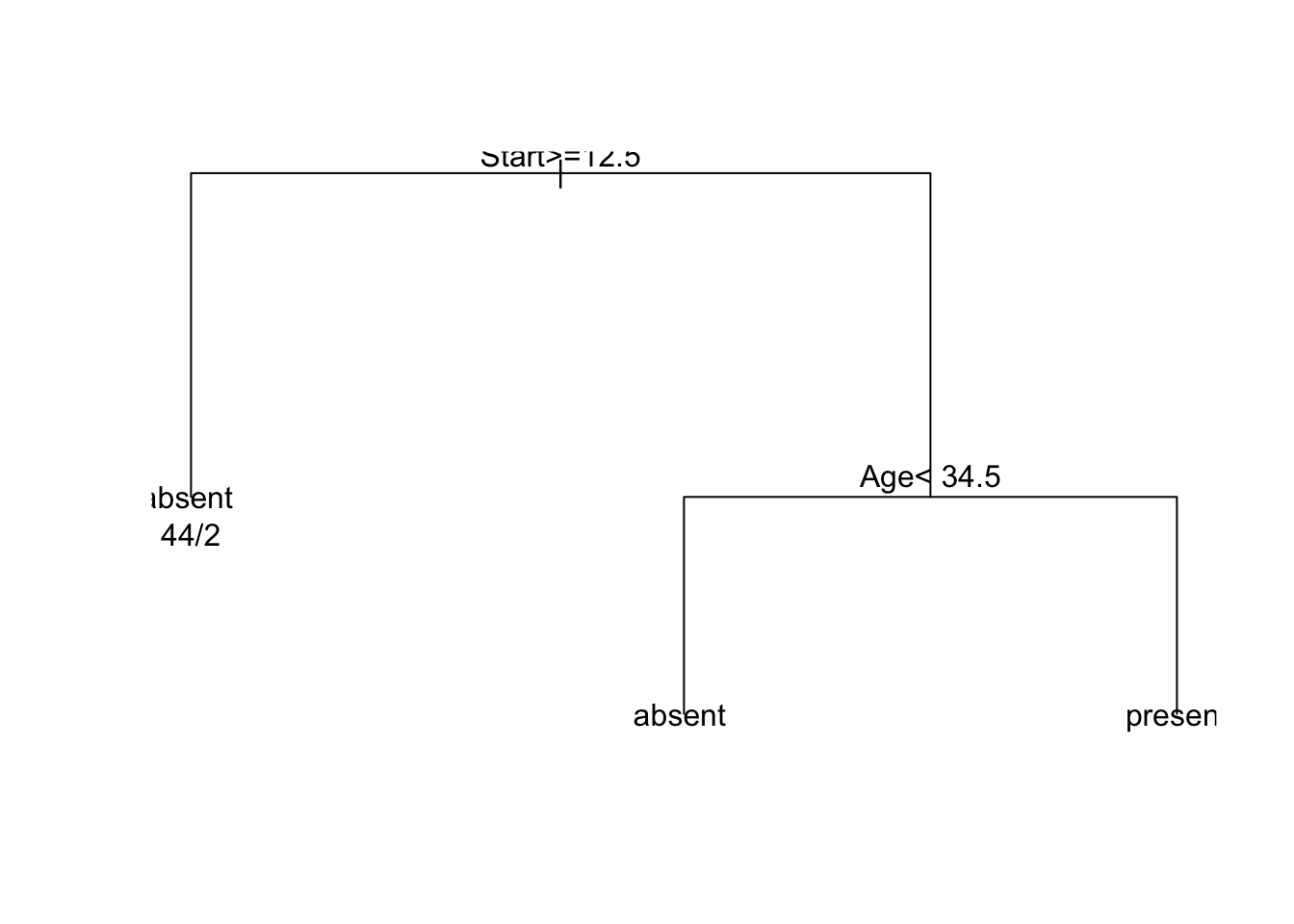 fit <- rpart(Kyphosis ~ Age + Number + Start, data = kyphosis)