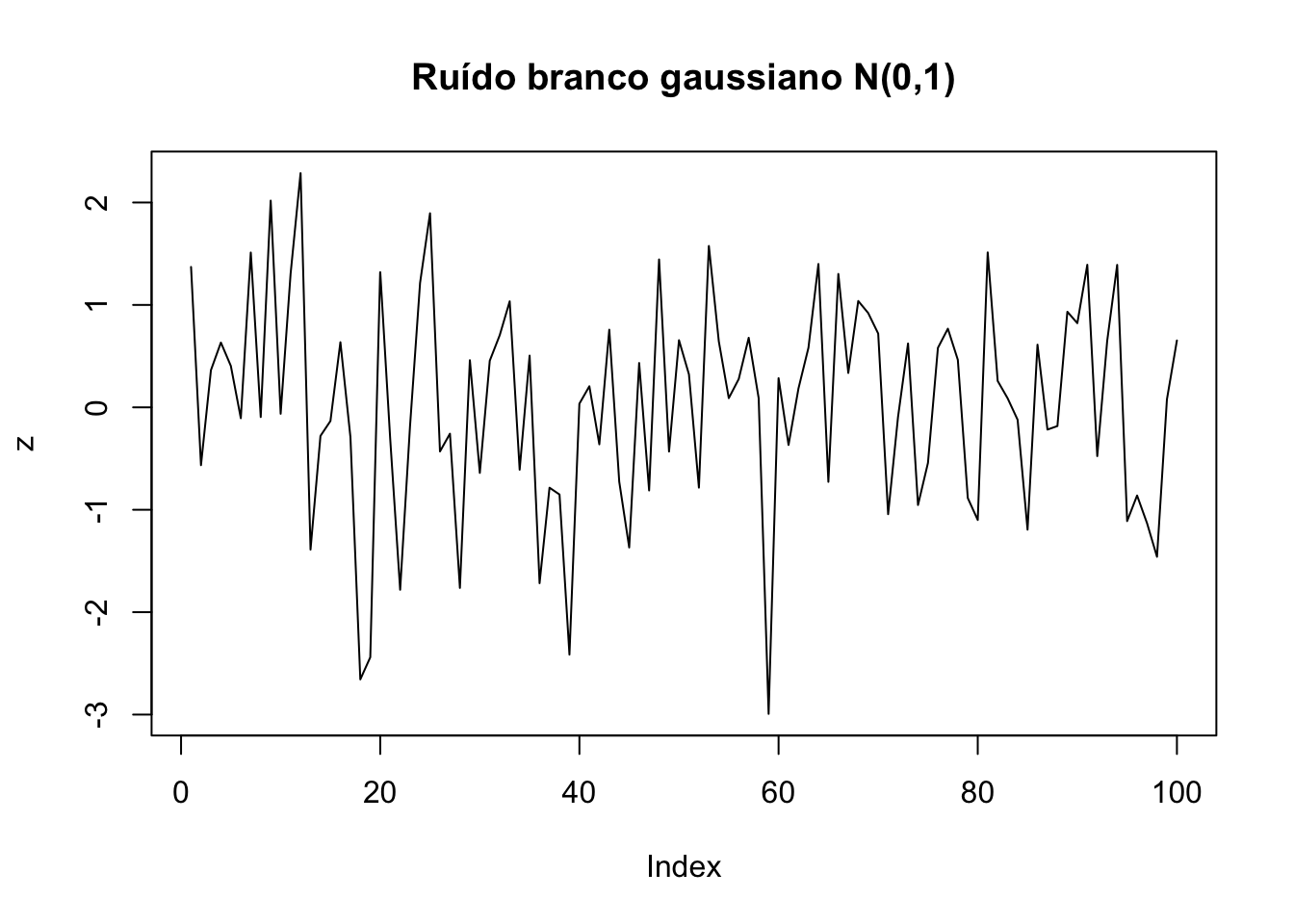 plot(z, type = 'l', main = 'Ruído branco gaussiano N(0,1)')