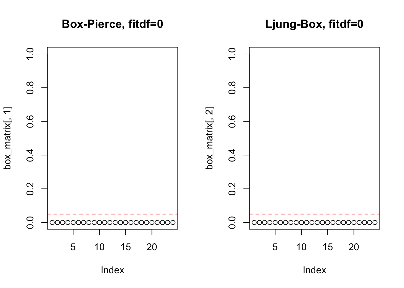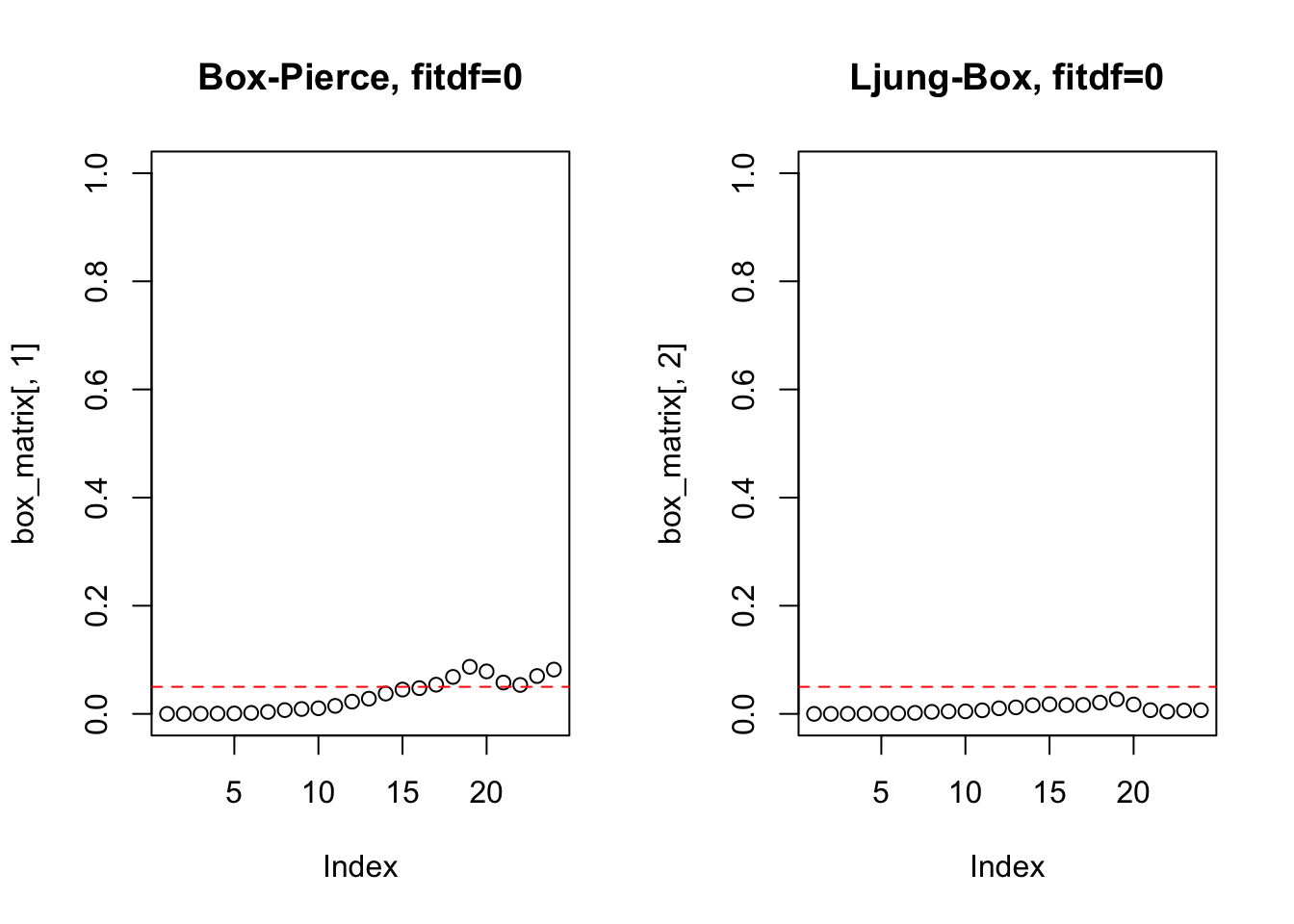 box_matrix[m,1] <- Box.test(x, lag = m, type = 'Box', fitdf = fitdf)$p.value