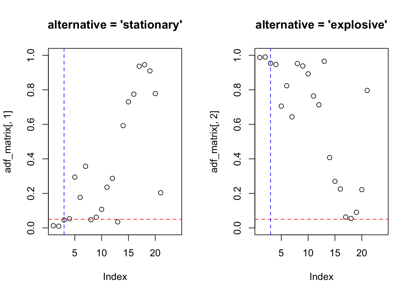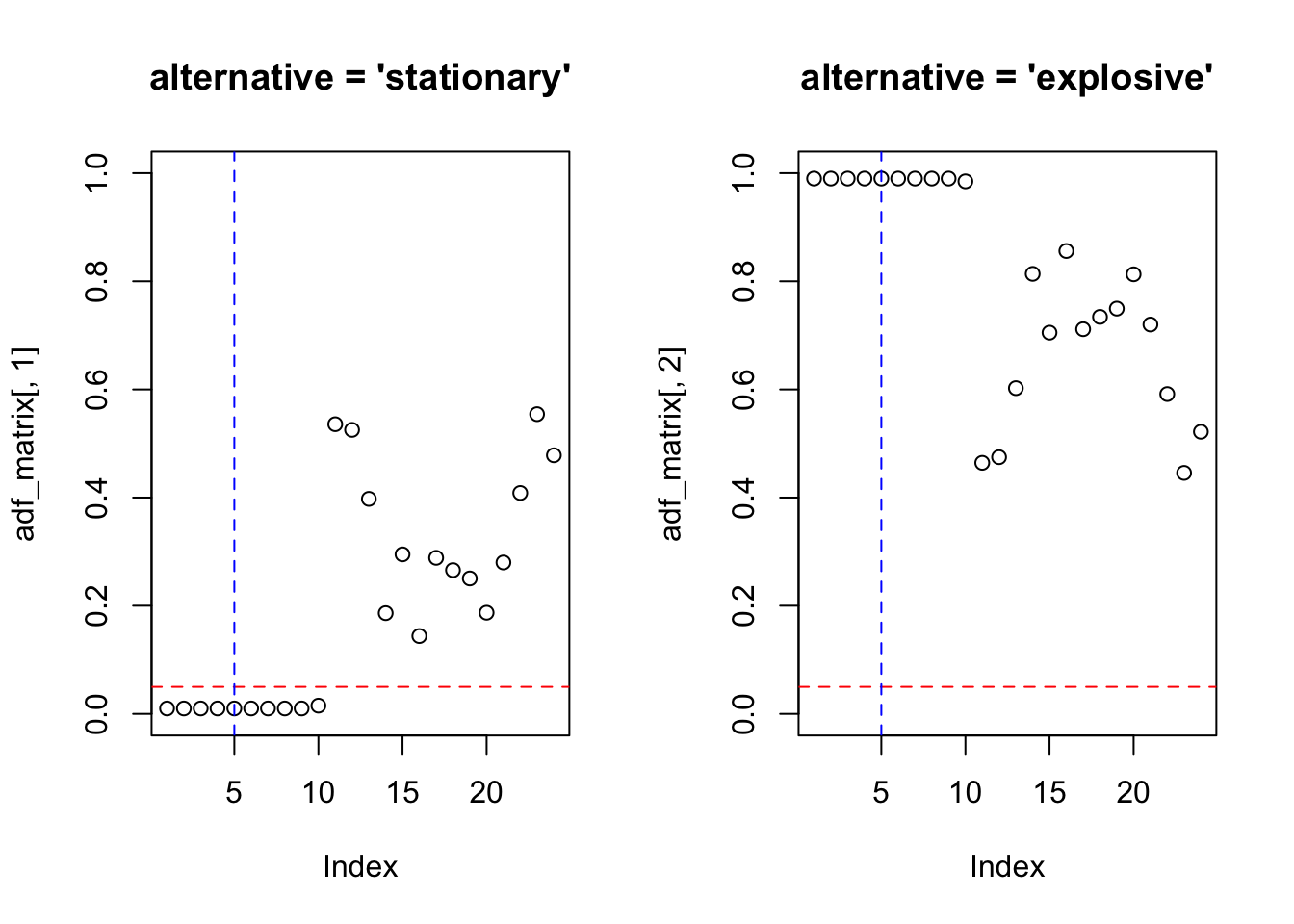 adf_matrix[m,2] <- tseries::adf.test(x, alternative = 'explosive', k = m)$p.value