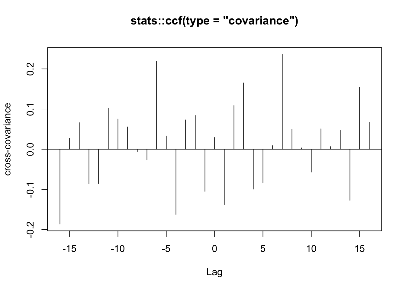 ylab = 'cross-covariance', main = 'stats::ccf(type = "covariance")')