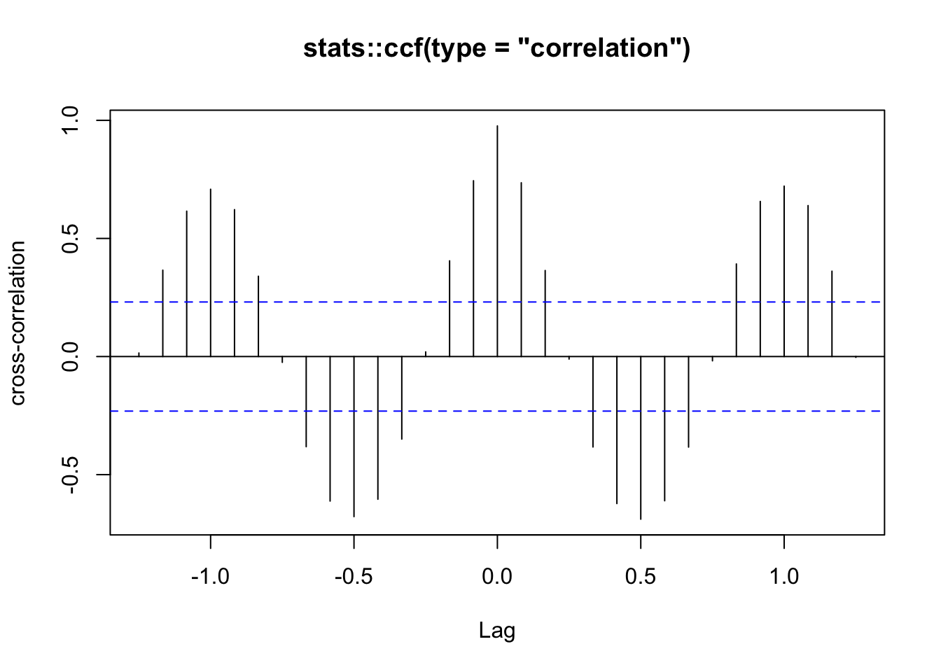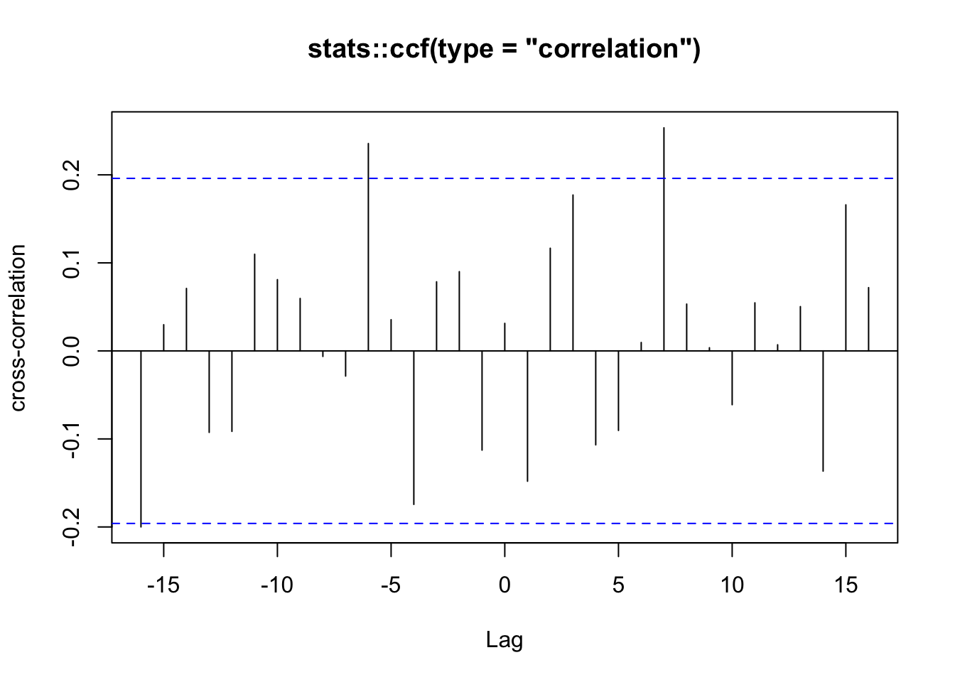 ylab = 'cross-correlation', main = 'stats::ccf(type = "correlation")')