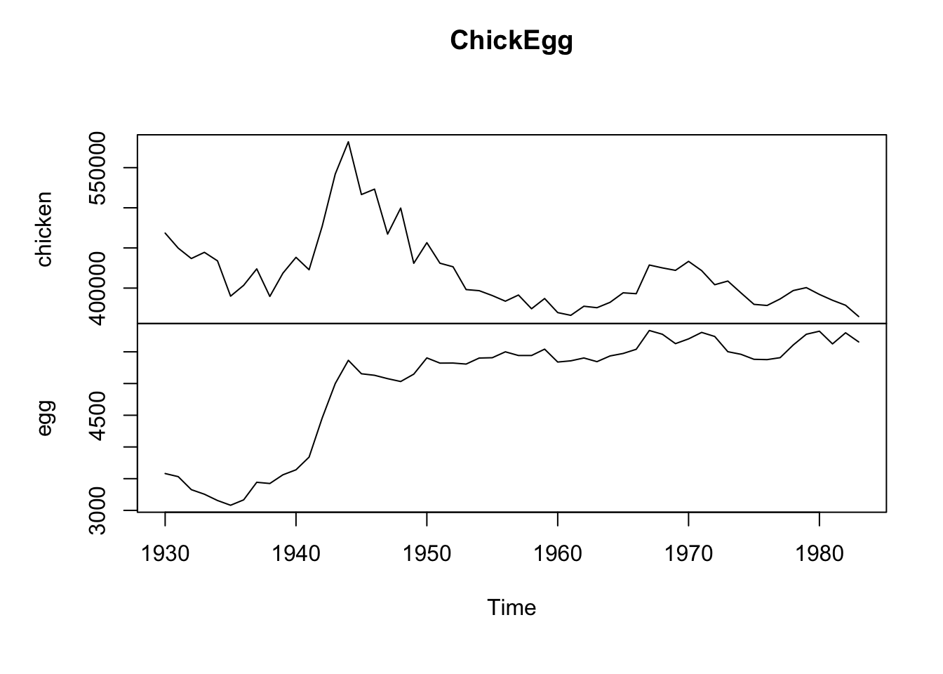 Exemplo 11.70 (Thurman, Fisher, et al. 1988) examinam séries temporais anuais dos EUA de 1930 a 1983 sobre produção de ovos e população de galinhas. O objetivo é responder à célebre pergunta: quem veio primeiro, o ovo ou a galinha? (Zeileis and Hothorn 2002) apresentam a série temporal ChickEgg