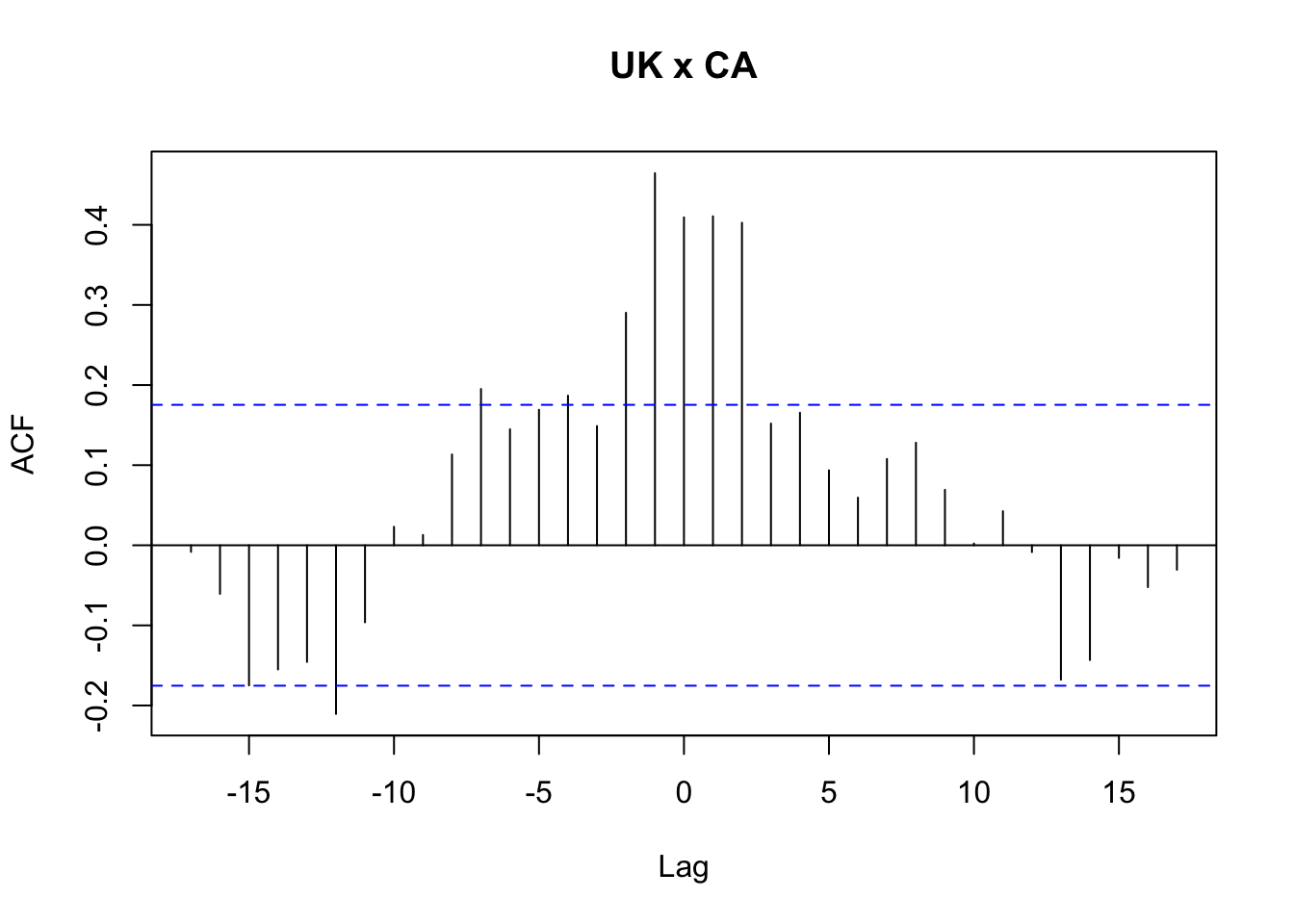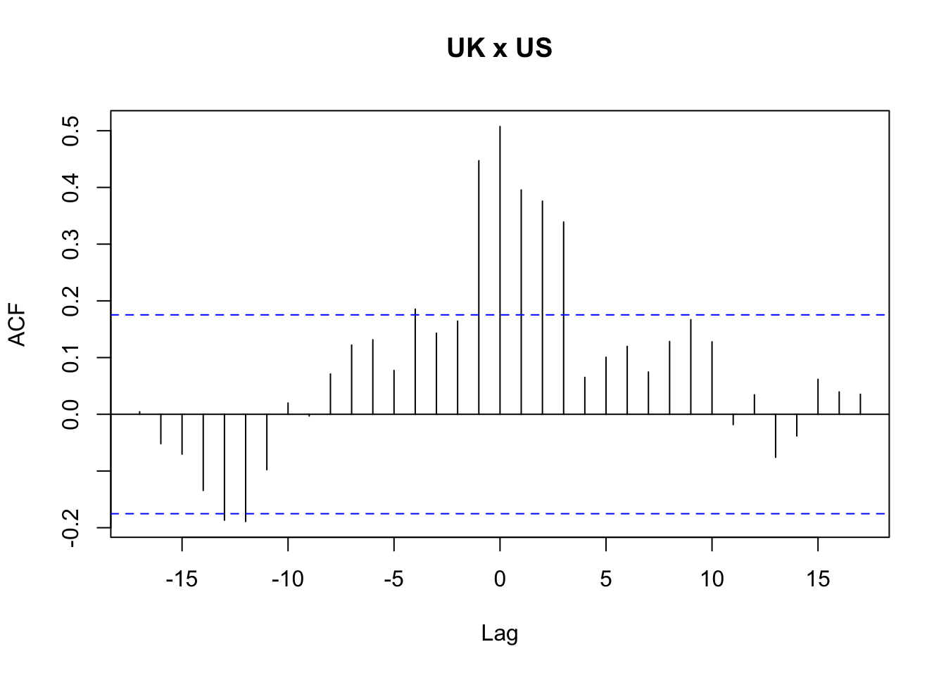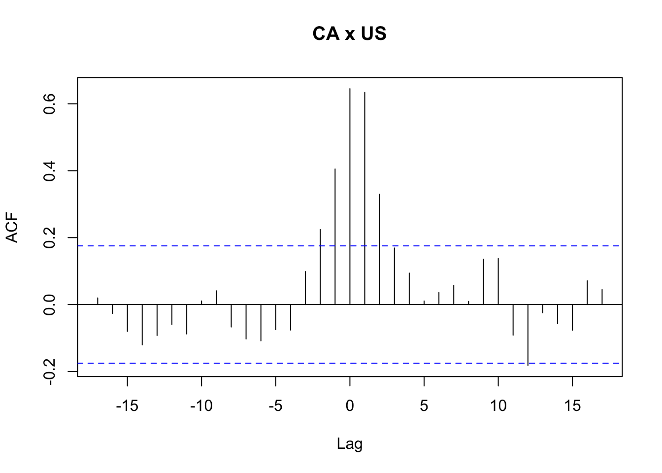O estimador da função de correlação cruzada é o correlograma cruzado tal que \[\begin{equation} \hat{\rho}_{xy}(k) = \frac{\hat{\gamma}_{xy}(k)}{\sqrt{\hat{\gamma}_{xx}(0) \hat{\gamma}_{yy}(0)}} \tag{11.57} \end{equation}\] onde \[\hat{\gamma}_{xx}(0) = \frac{1}{n} \sum_{t=1}^{n} (x_t-\bar{x})^2, \;\;\;\;\; \hat{\gamma}_{yy}(0) = \frac{1}{n} \sum_{t=1}^{n} (y_t-\bar{y})^2,\] \[\bar{x} = \frac{1}{n} \sum_{t=1}^{n} x_t, \;\;\;\;\; \bar{y} = \frac{1}{n} \sum_{t=1}^{n} y_t,\] \[\hat{\gamma}_{xy}(k) = \left\{ \begin{array}{l l} n^{-1} \sum_{t=k+1}^{n} (x_{t}-\bar{x}) (x_{t-k}-\bar{y}), & \quad k \ge 0\\ n^{-1} \sum_{t=1}^{n+k} (x_{t}-\bar{x}) (x_{t-k}-\bar{y}), & \quad k < 0\\ \end{array} \right. \]