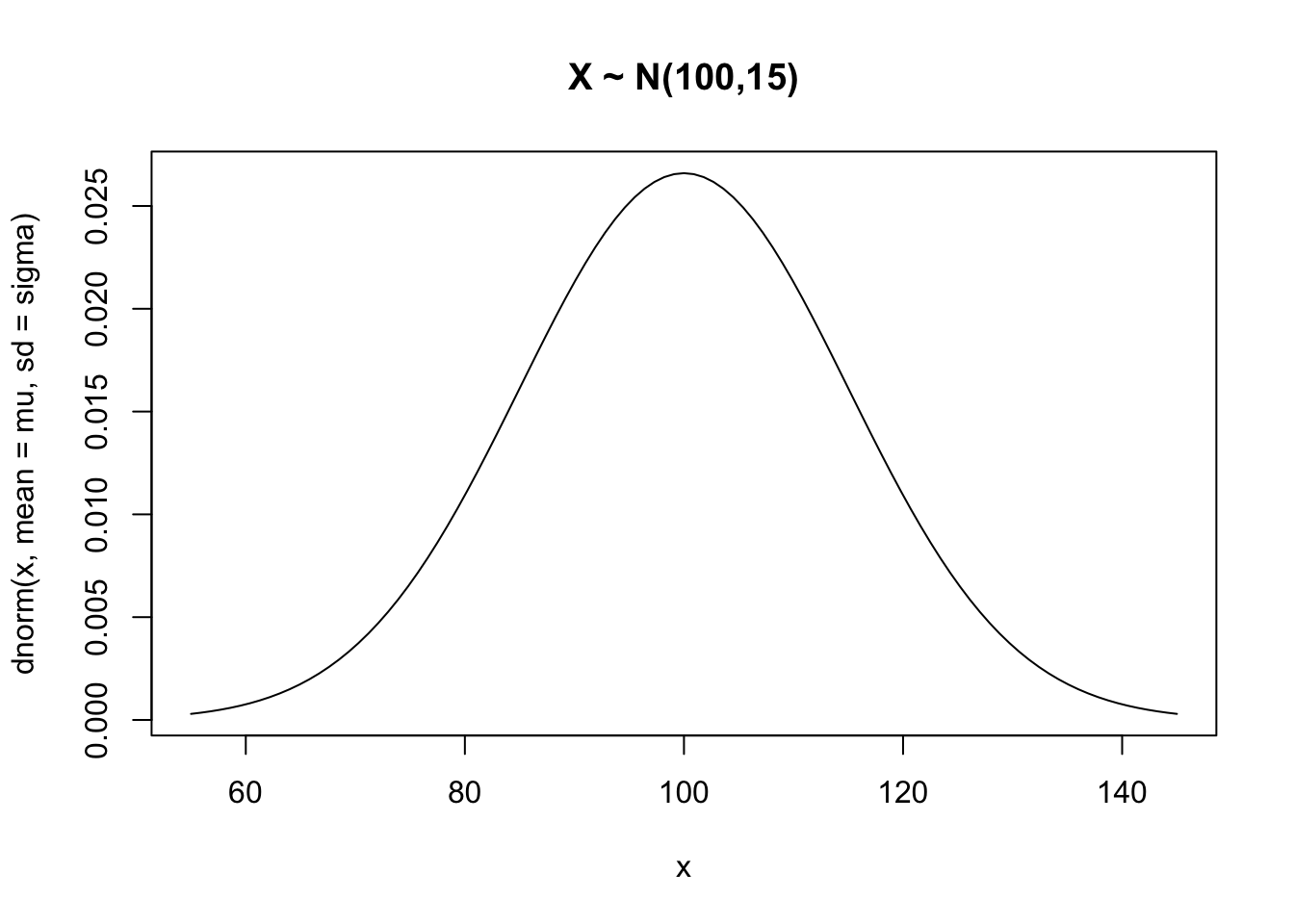 Exemplo 4.26 Considere a variável aleatória \(X\): QI da população mundial, admitida com distribuição normal de média \(\mu=100\) e desvio padrão de \(\sigma=15\), anotada por \(X \sim \mathcal{N}(100,15)\).