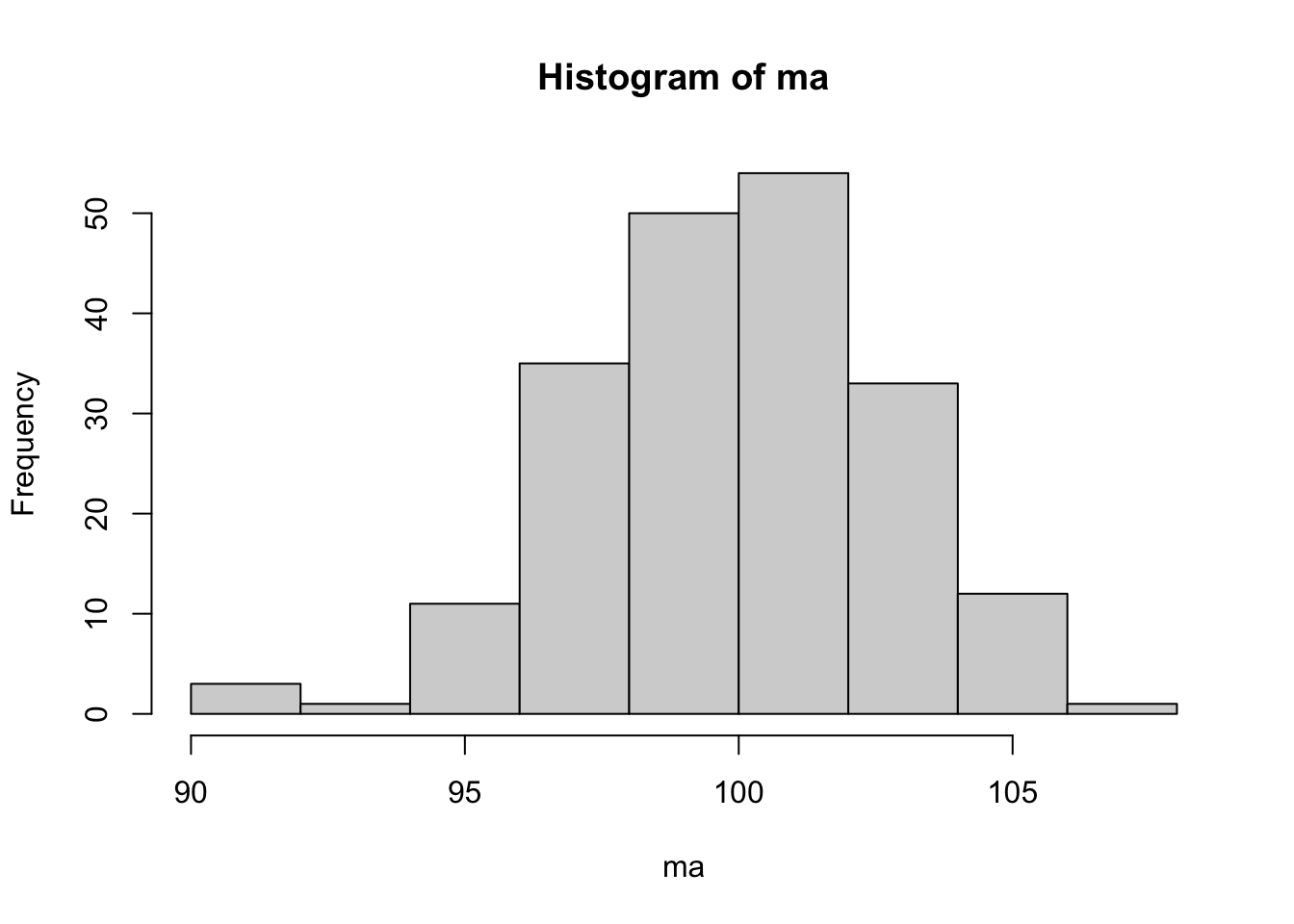 print(f"sigma/sqrt(n0): {sigma/np.sqrt(n0):.4f}")Exercício 4.7 Refaça o Exemplo 4.26 alterando os valores de n0 e n, verificando o que ocorre no histograma, média e desvio padrão de ma. Atente para o fato de que valores de n maiores que 1000 podem tornar o processo custoso computacionalmente.