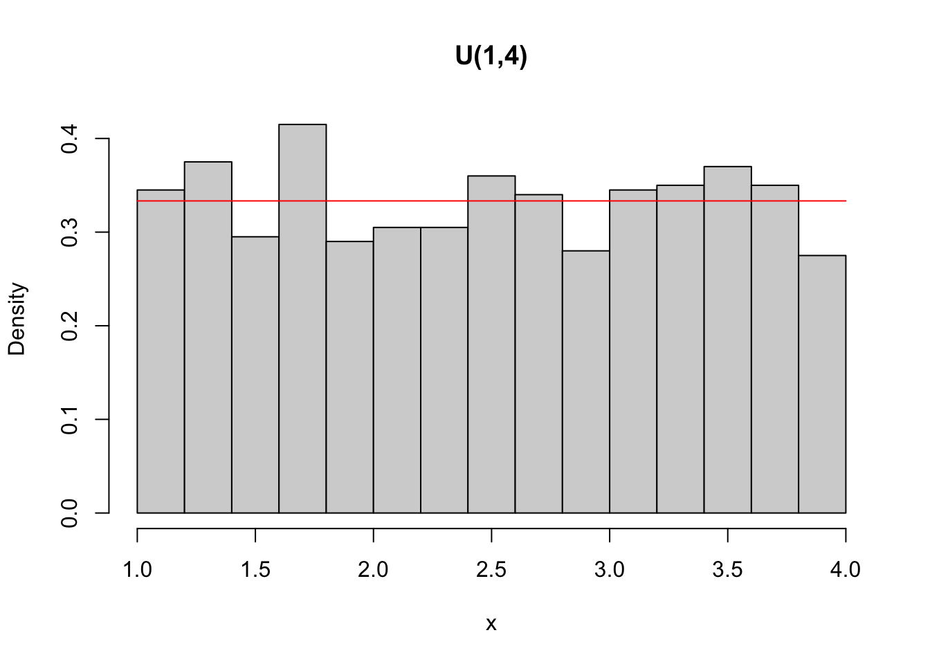 curve(dunif(x,1,4), add = TRUE, col = 'red')
