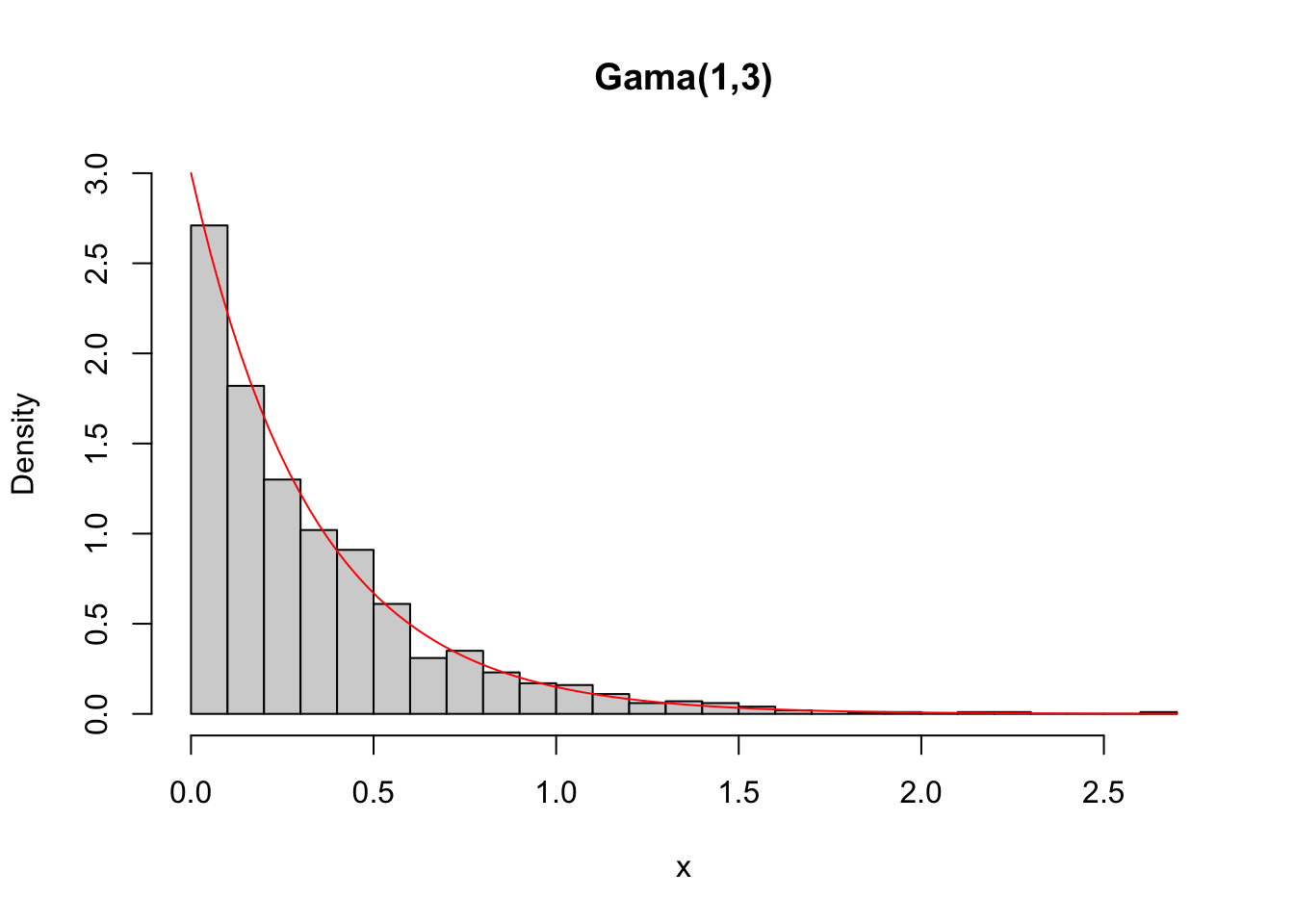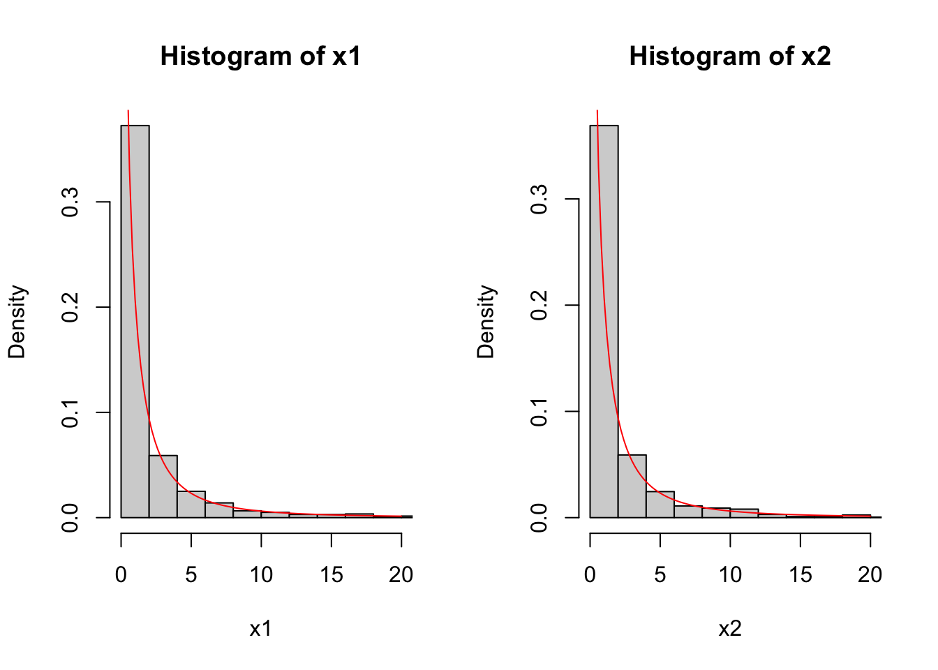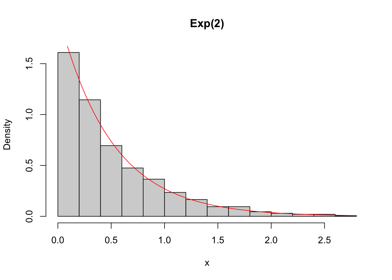 curve(dexp(x,2), add = TRUE, col = 'red')