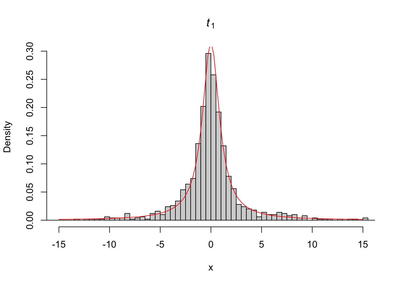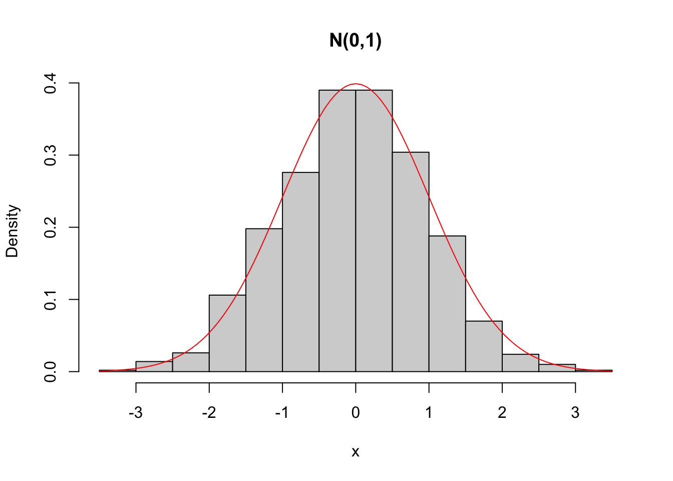 hist(x, freq = FALSE, main = 'N(0,1)')