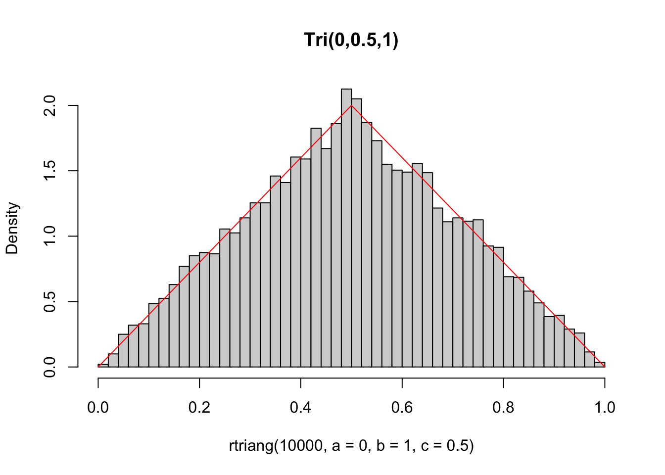 curve(dtriang(x, a=0, b=1, c=0.5), col = 'red', add = TRUE)