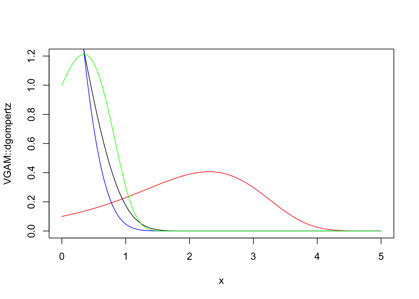ylim = c(0,1.2), col = 'red', ylab = 'VGAM::dgompertz')