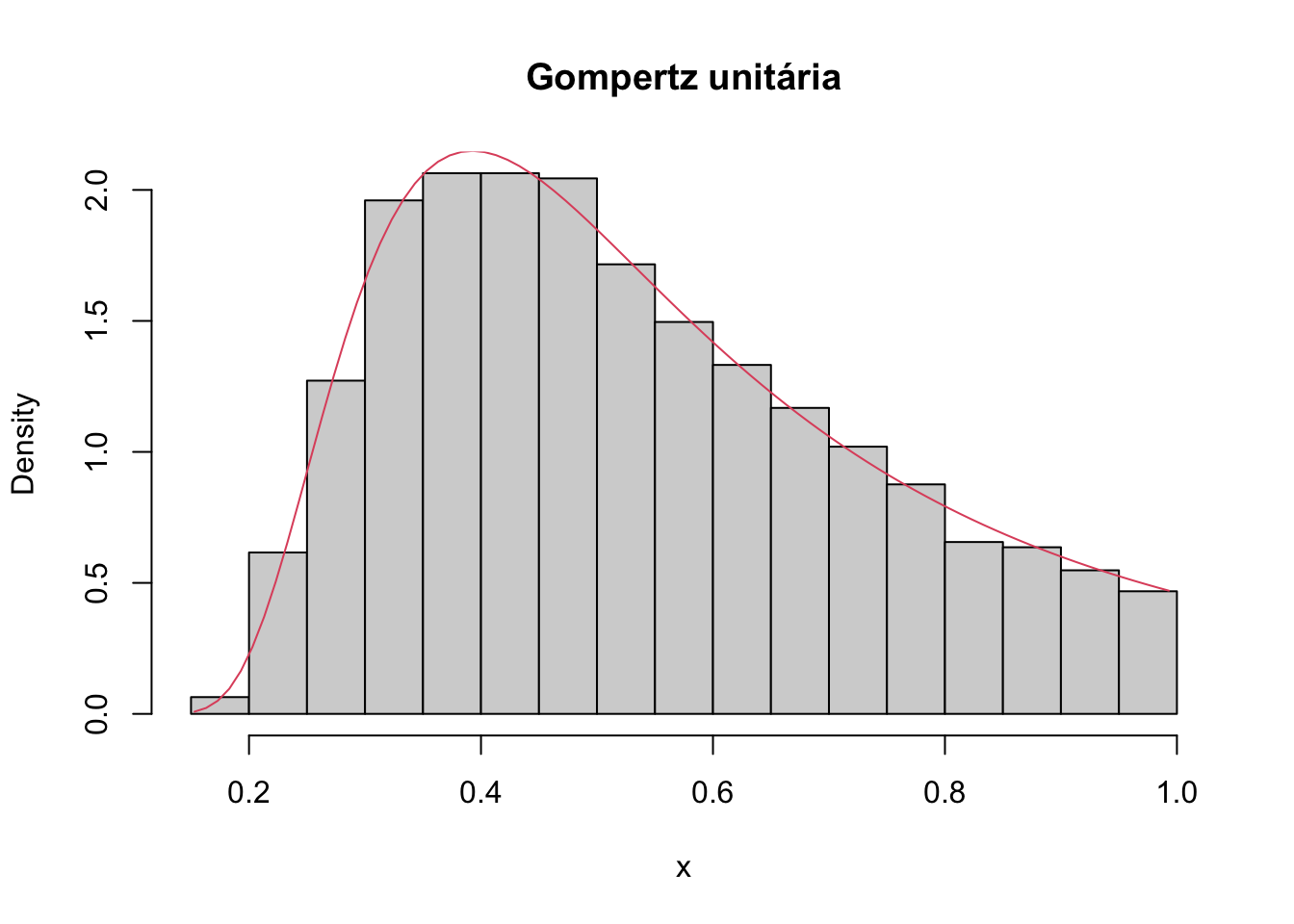(Mazucheli, Menezes, and Dey 2019) definem a distribuição de Gompertz unitária a partir da transformação do tipo \[X=e^{-Y}\]