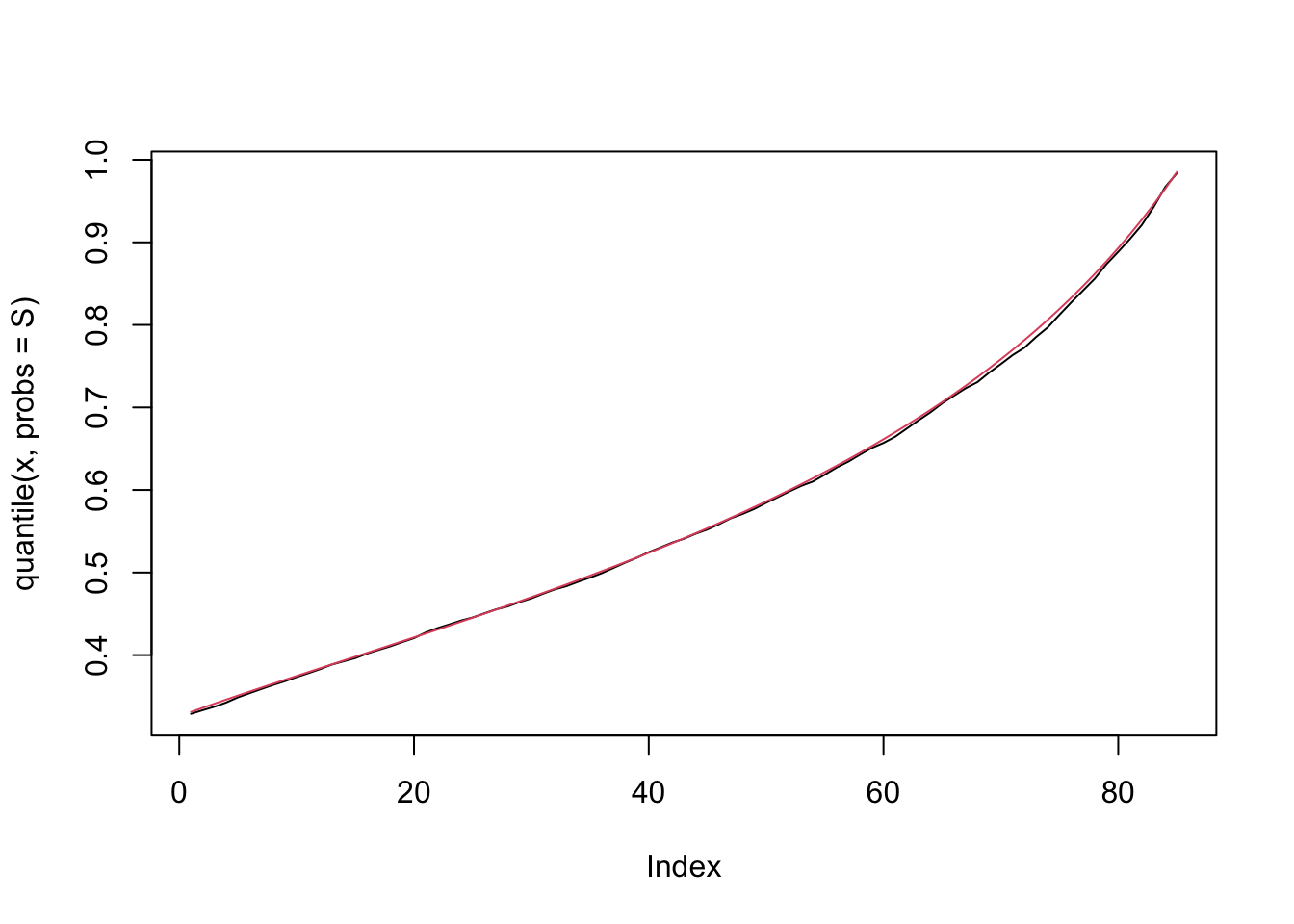lines(qugompertz(p = S, mu = 0.5, theta = 2, tau = 0.5), col=2)