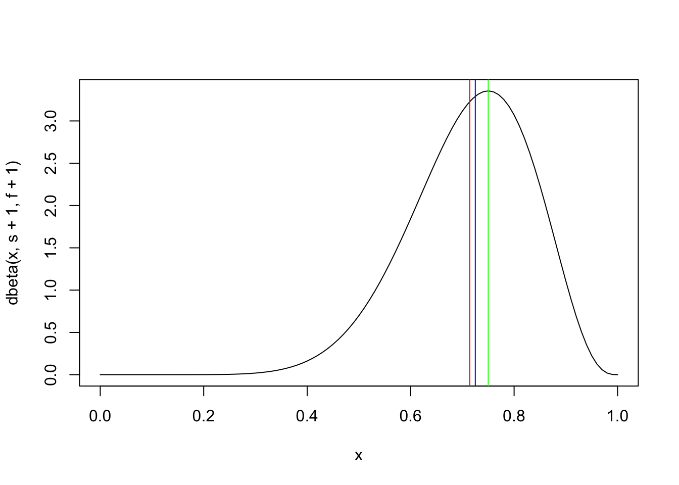 (EX = (s+1)/(s+1+f+1)) # Média a posteriori (vermelho)## [1] 0.7142857