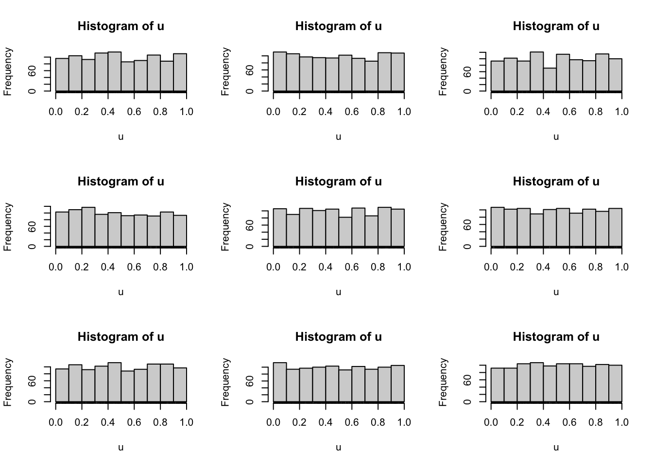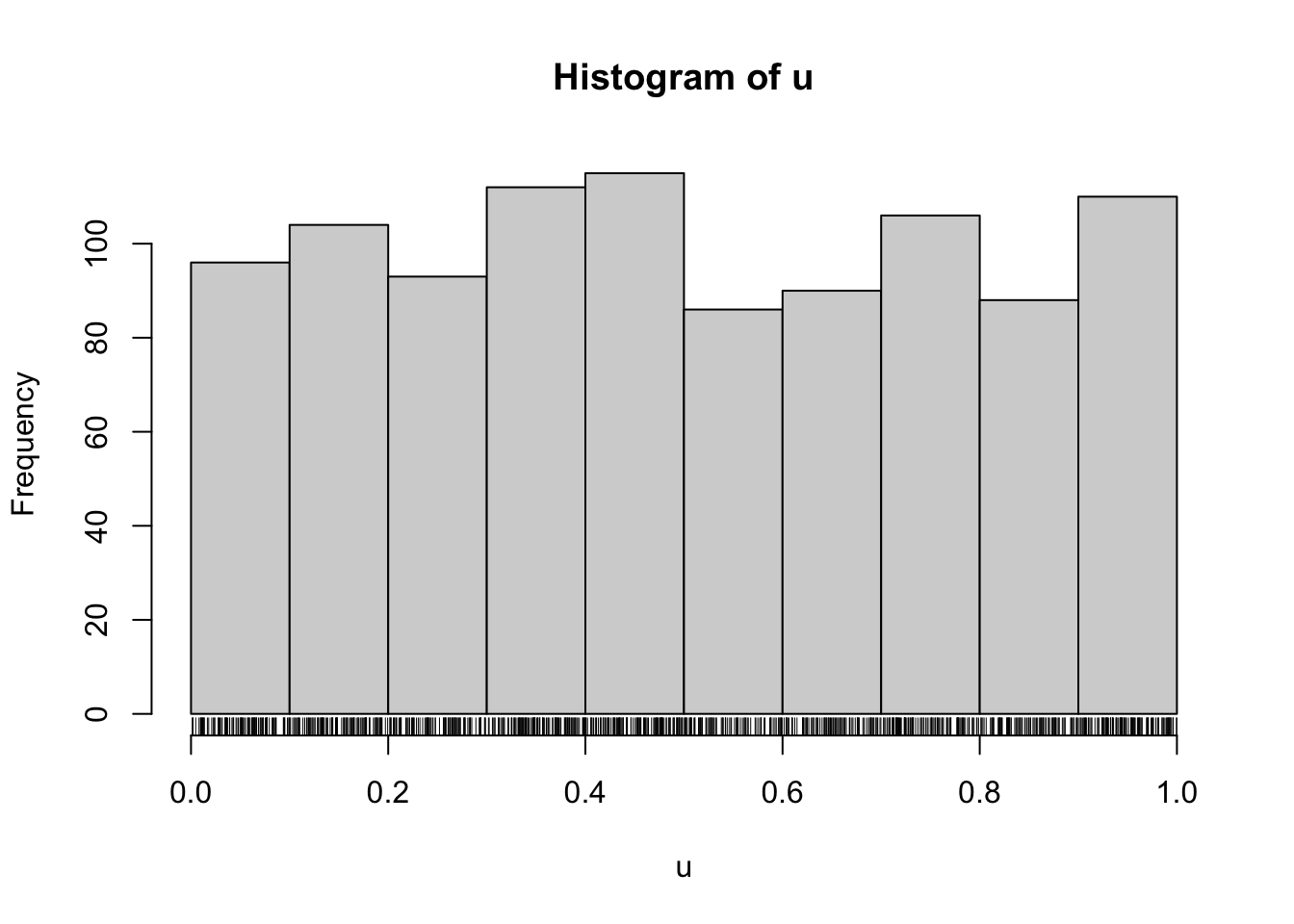- Obtenha \(u_1,u_2,\ldots,u_n\), todos de uma \(\mathcal{U}(0,1)\).