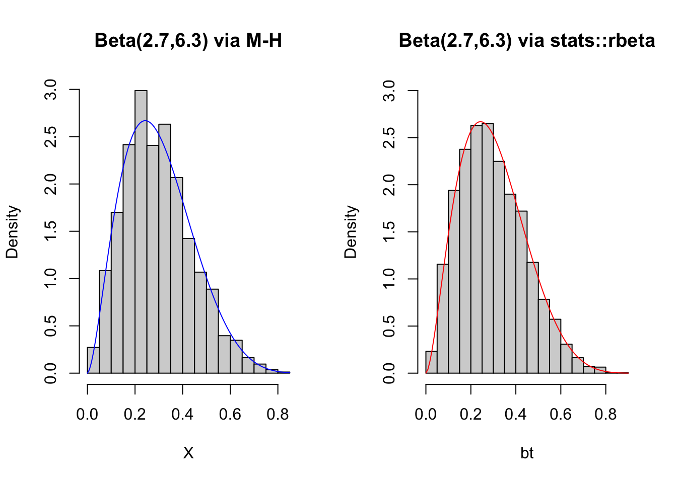 hist(X, freq = FALSE, main = 'Beta(2.7,6.3) via M-H')
