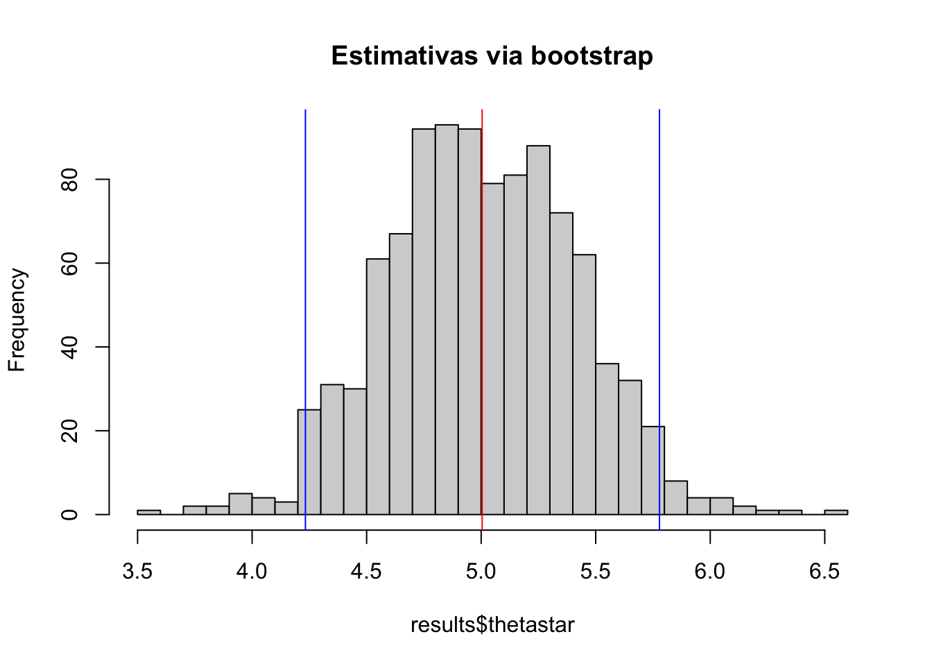 hist(results$thetastar, 25, main = 'Estimativas via bootstrap')