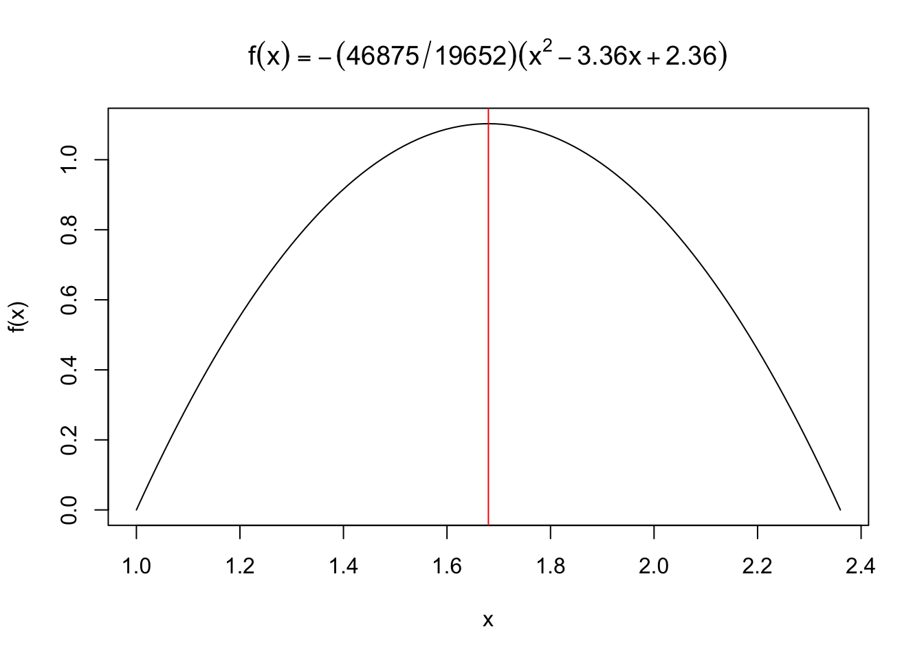 f <- function(x){-(46875/19652)*(x^2 - 3.36*x + 2.36)}
