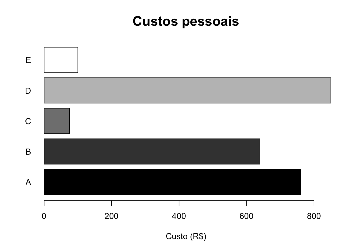 barplot(custos, xlab = 'Custo (R$)', main = 'Custos pessoais',