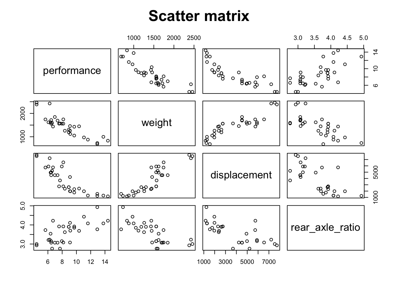 pairs(~ performance + weight + displacement + rear_axle_ratio,