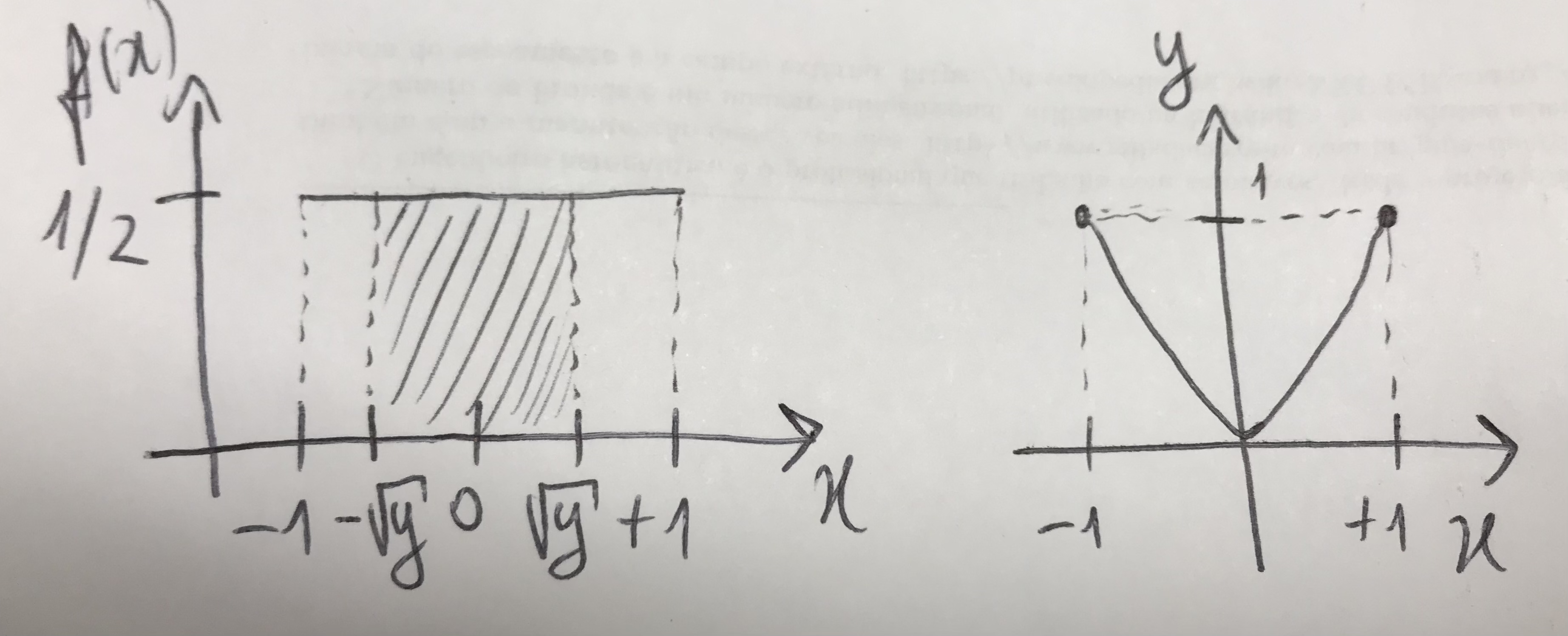 Example 3.52 Let the random variable be \(X \sim \mathcal{U}(-1,1)\) and the function \(Y=X^2\). It is possible to obtain the pdf \(g(y)\). Initially consider the graphs of \(f(x)\) by \(x\) and \(y\) by \(x\). From the graphs it is possible to verify that \(x \in (-1,1)\), \(f(x)=\frac{1}{2}\) and \(y \in (0,1)\). The limits \(-\sqrt{y}\) and \(\sqrt{y}\) are obtained during Step 1 below.