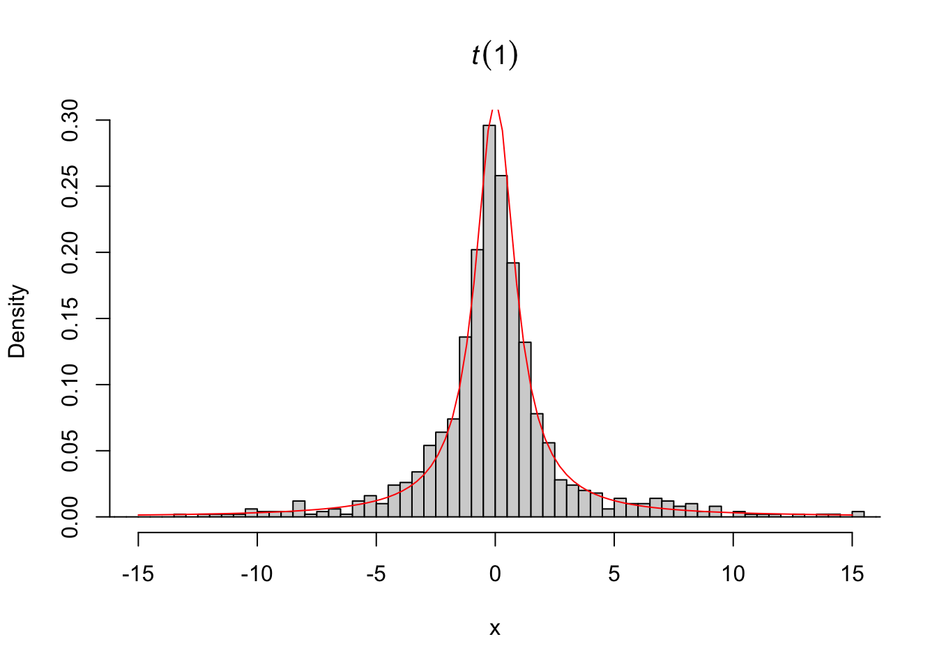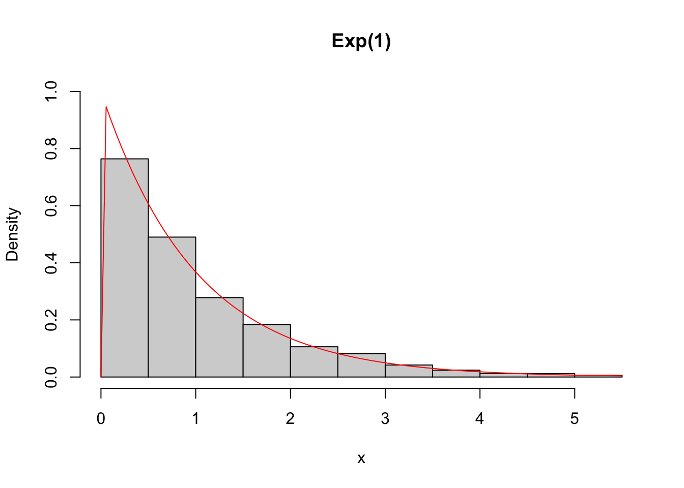 curve(dexp(x,1), add = T, col = 'red')