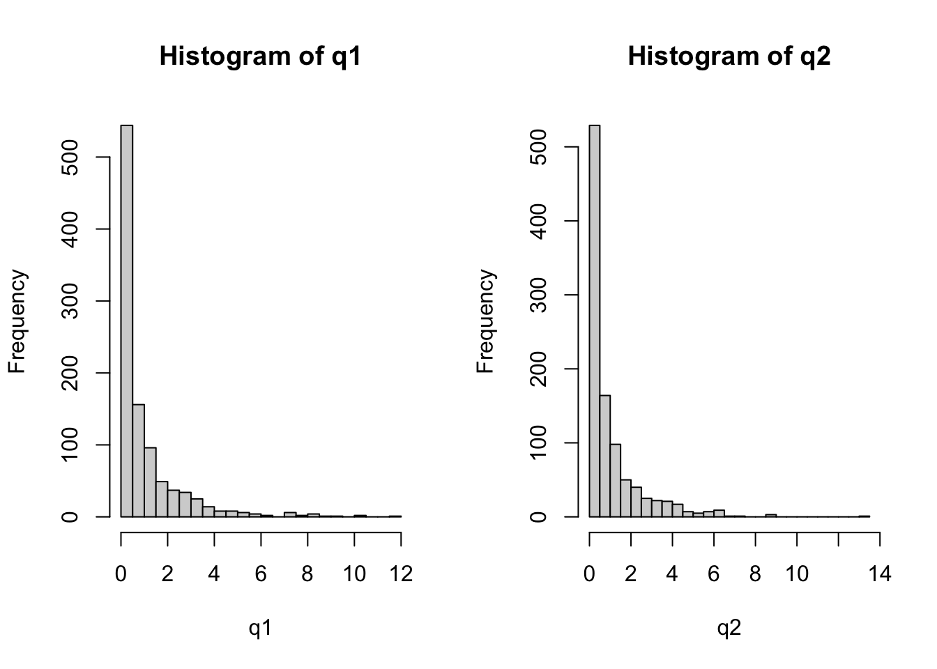 set.seed(5678); q2 <- rchisq(1000, 3)