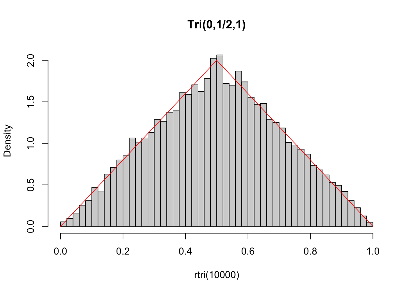 set.seed(2); hist(rtri(10000), 40, freq = FALSE, main = 'Tri(0,1/2,1)')
