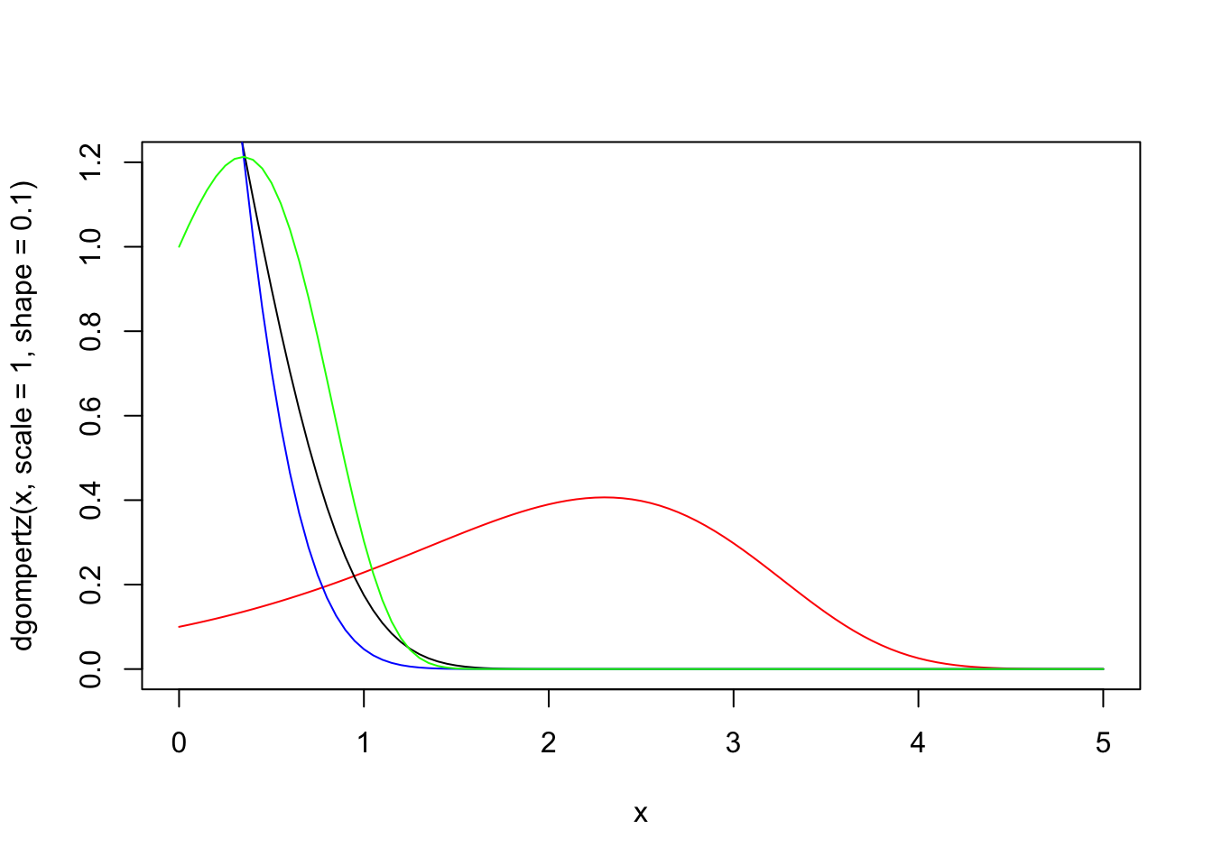 curve(dgompertz(x, scale = 2, shape = 1), xlim = c(0,5), ylim = c(0,1.2),