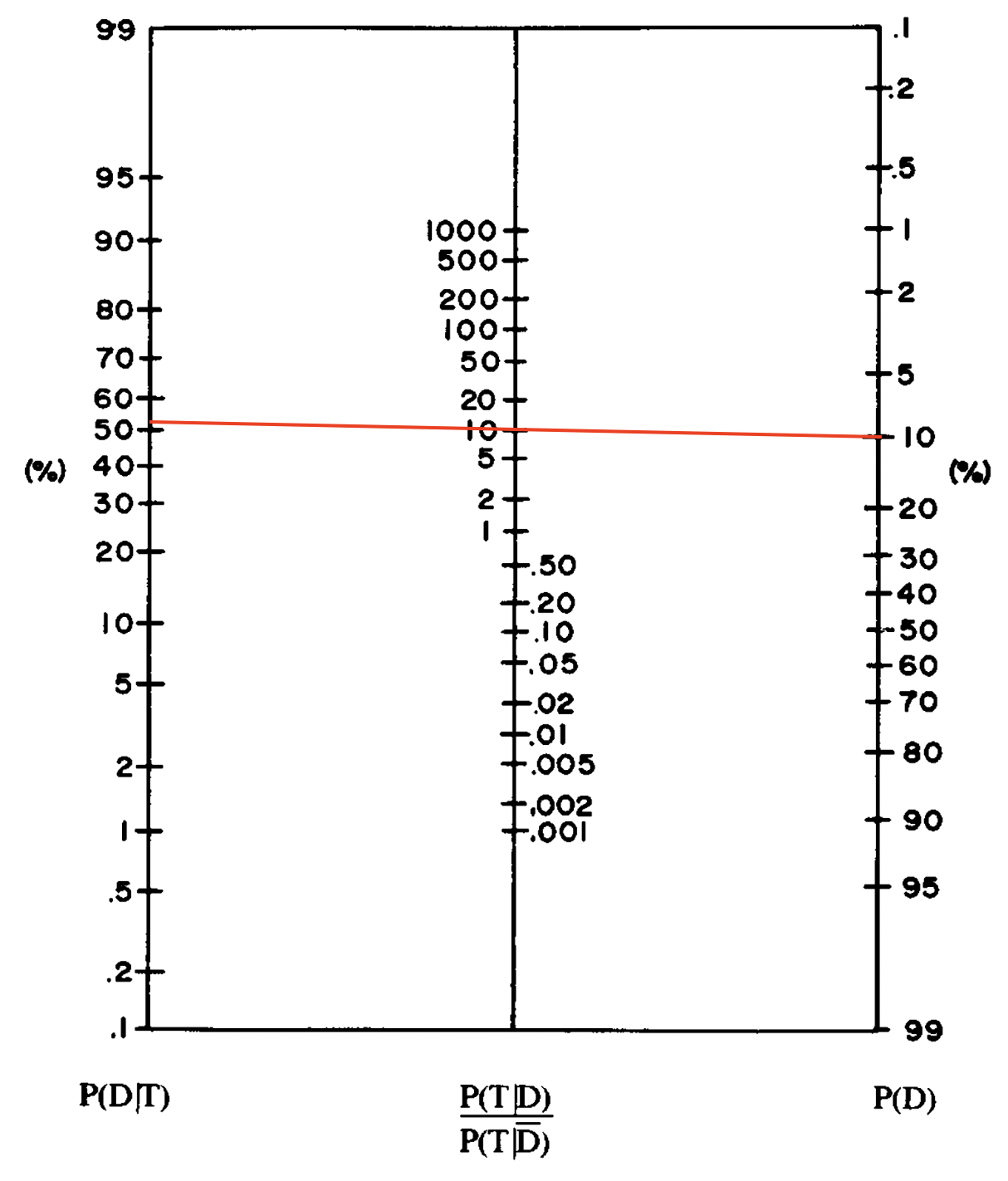 If \(Pr(T|D)=100\%\) and \(Pr(T|\bar{D})=10\%\), then \(\frac{Pr(T|D)}{Pr(T|\bar{D})}=10\). For \(Pr(D) = 10\%\), a line drawn between these values returns something close to \(Pr(D|T)=53\%\).